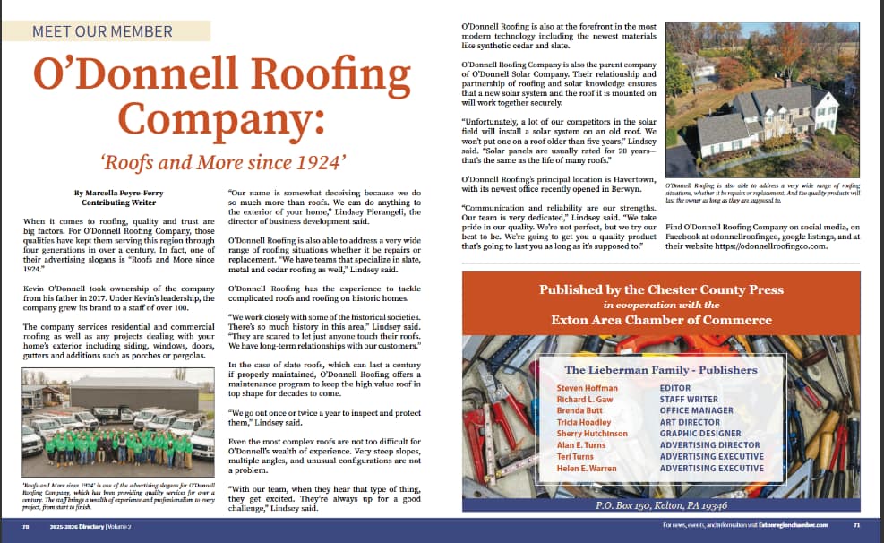 O’Donnell Roofing’s principal location is Havertown, with its newest office recently opened in Berwyn.
